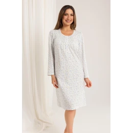 Koszula nocna 015 BIG J/25 to elegancki i funkcjonalny model, uszyty z wysokiej jakości, wzorzystej bawełny. Miękki i oddychający materiał gwarantuje komfort noszenia, a klasyczny fason doskonale sprawdza się zarówno do spania, jak i relaksu w domowym zaciszu. Koszula posiada długi rękaw oraz delikatnie marszczony dekolt zapinany na guziczki – co czyni ją także praktyczną opcją dla mam karmiących. Długość za kolano zapewnia dodatkową wygodę i ochronę w chłodniejsze wieczory.