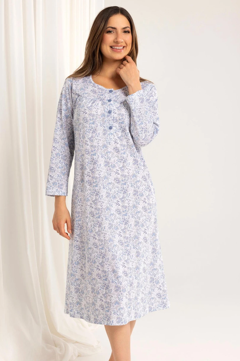 Dámská noční košile Regina 017 BIG J/25 je klasický model vytvořený pro pohodlí a ženský styl. Je vyrobena ze 100% kvalitní bavlny s jemným vzorovaným povrchem a poskytuje prodyšnost a měkkost v každé fázi používání. Košile má délku ke kolenům, dlouhé rukávy a decentně nařasený výstřih na knoflíčky - ideální i pro kojící maminky. Díky klasickému střihu je košile vhodná nejen jako noční oděv, ale také jako pohodlné domácí oblečení. Je dokonalou kombinací elegance, funkčnosti a pohodlí.