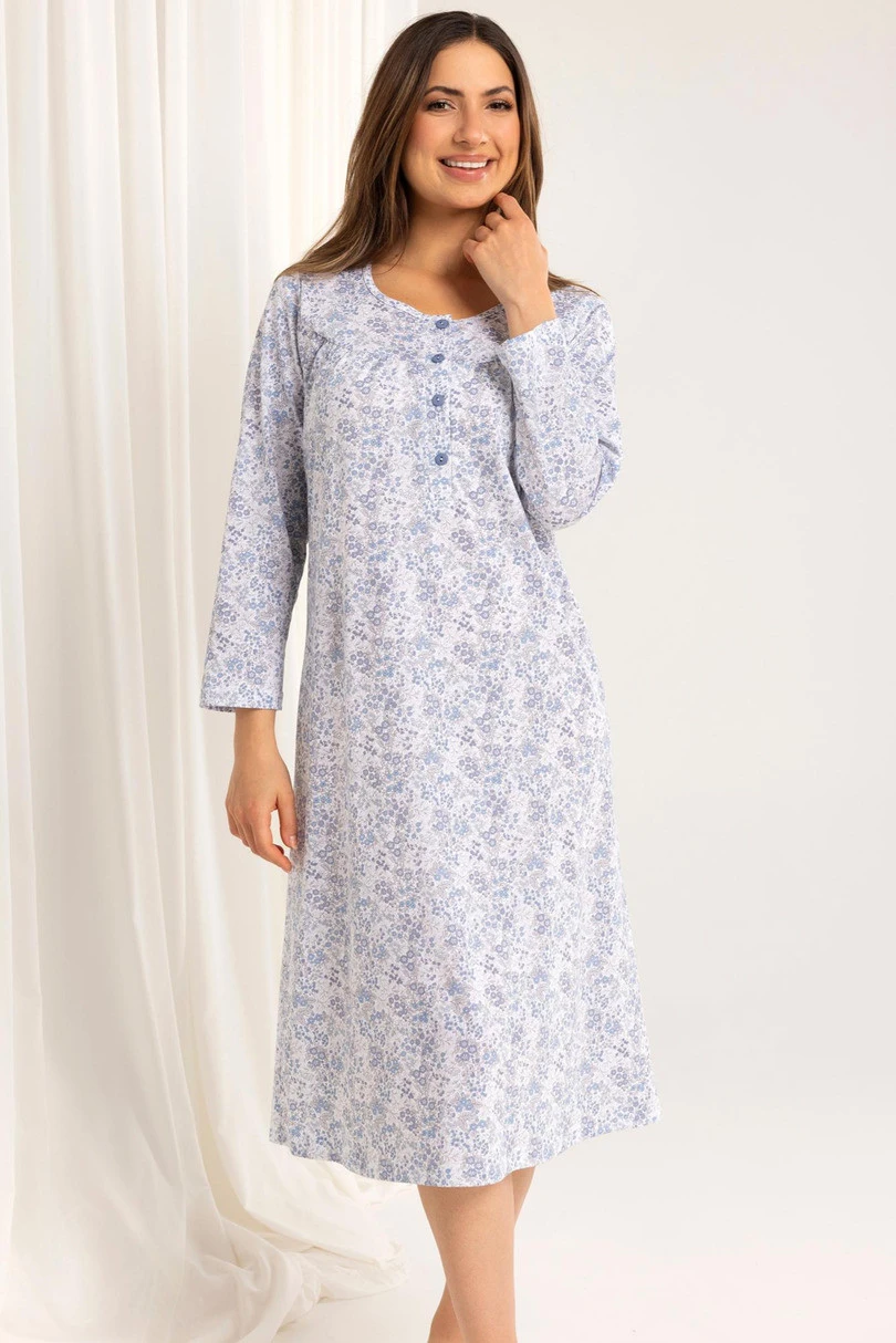Dámská noční košile 017 J/25 značky Regina je klasický model vytvořený s ohledem na pohodlí a ženský styl. Je vyrobena z vysoce kvalitní 100% bavlny s jemným vzorovaným povrchem a poskytuje prodyšnost a měkkost v každé fázi používání. Košile má délku ke kolenům, dlouhé rukávy a jemně nařasený výstřih na knoflíčky – ideální také pro kojící matky. Díky klasickému tvaru je košile vhodná nejen jako noční oděv, ale také jako pohodlné domácí oblečení. Je dokonalou kombinací elegance, funkčnosti a pohodlí.