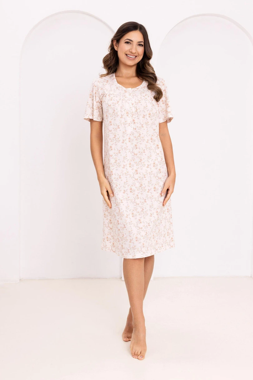 Pohodlná noční košile klasického volného střihu, ideální pro ženy, které si cení pohodlí a volnosti. Světlé barvy s jemným drobným květinovým motivem dodávají celku lehkost a nadčasovou eleganci. Díky krátkým rukávům a délce ke kolenům je košile ideální jak v létě, tak po celý rok. Jemné řasení pod prsy zajišťuje pohodlné nošení a neomezuje v pohybu, což zaručuje pohodlí během spánku i domácího odpočinku.
