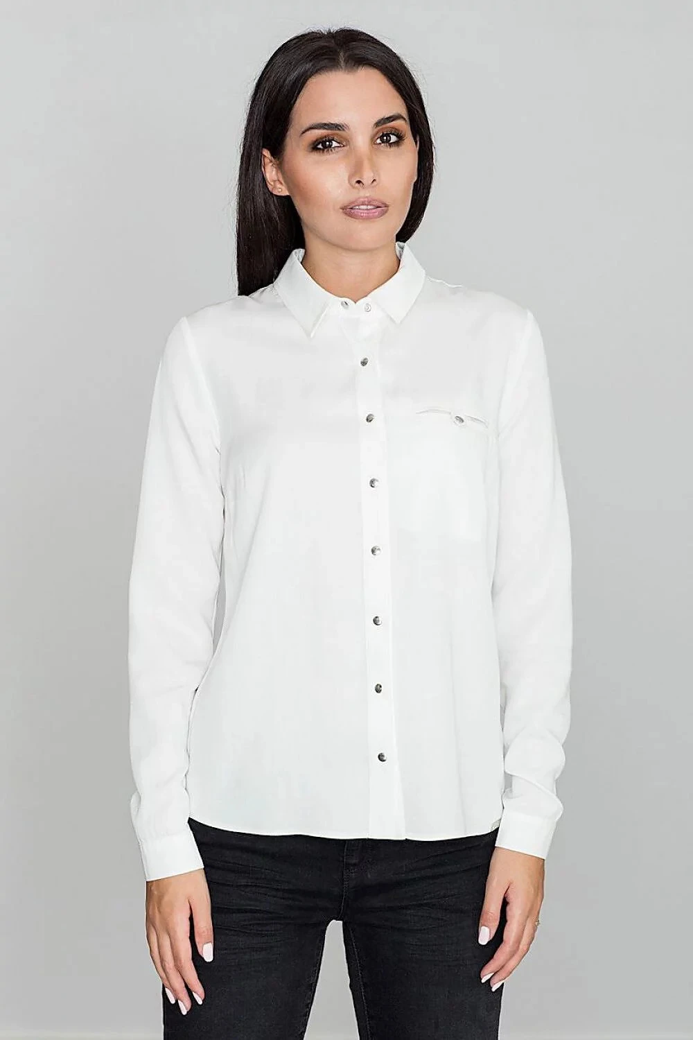 Klasická košile s dlouhým rukávem z vysoce kvalitní viskózy zajišťuje každodenní pohodlí. Zapínání na ozdobné kovové patentky. Náprsní kapsa se zapínáním na kovový knoflík.