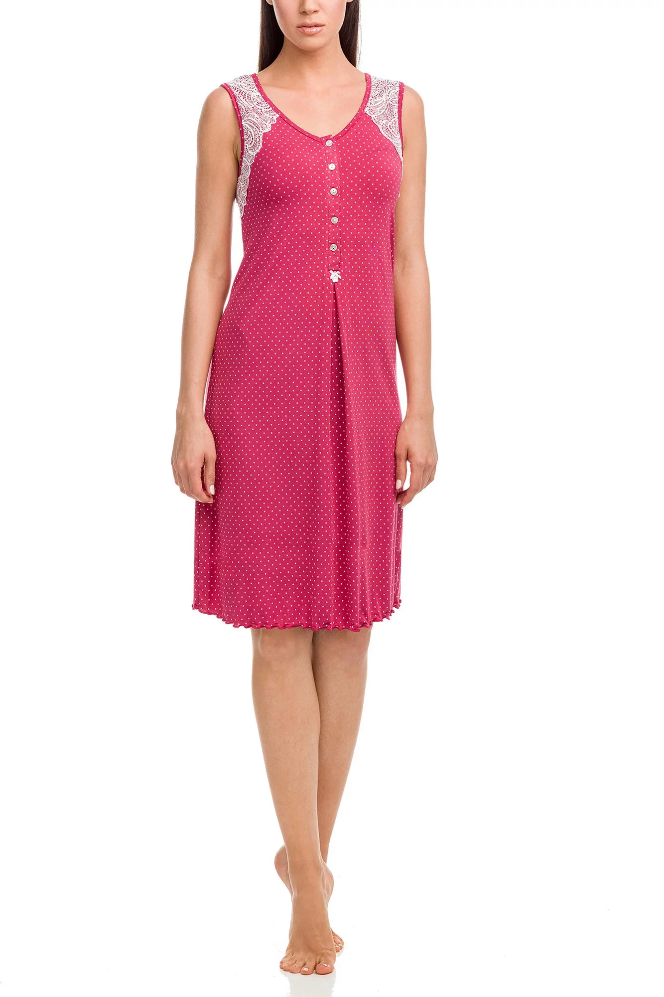 Elegantní dámská noční košile v nádherném jahodovém odstínu a drobným potiskem puntíků, ve kterém budete nepřehlédnutelná! Košilku zdobí nádherná krajka na ramenech.