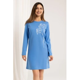 Koszula nocna 160 J/25 to klasyczna, bawełniana propozycja dla kobiet ceniących wygodę i prostotę. Wykonana z wysokiej jakości, 100% bawełny, jest przewiewna, miękka i przyjazna dla skóry, co sprawia, że idealnie sprawdza się podczas snu. Model posiada długi rękaw, półokrągły dekolt oraz delikatny nadruk z przodu, który nadaje koszuli lekkości i kobiecego uroku. Długość przed kolano i luźny krój zapewniają swobodę ruchów i wygodę noszenia przez cały rok.