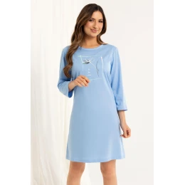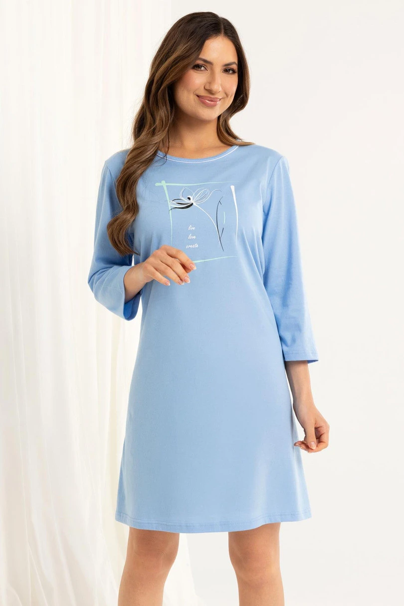 Koszula nocna 166 BIG J/25 to praktyczna i stylowa propozycja dla kobiet ceniących komfort oraz klasyczne fasony. Uszyta z wysokiej jakości, 100% bawełny, jest przewiewna, miękka i przyjazna dla skóry. Model posiada rękaw 3/4 oraz półokrągły dekolt, które zapewniają wygodę noszenia niezależnie od pory roku. Długość do kolan i delikatny nadruk na przodzie nadają koszuli kobiecego uroku i lekkości. To idealny wybór do snu i domowego wypoczynku.