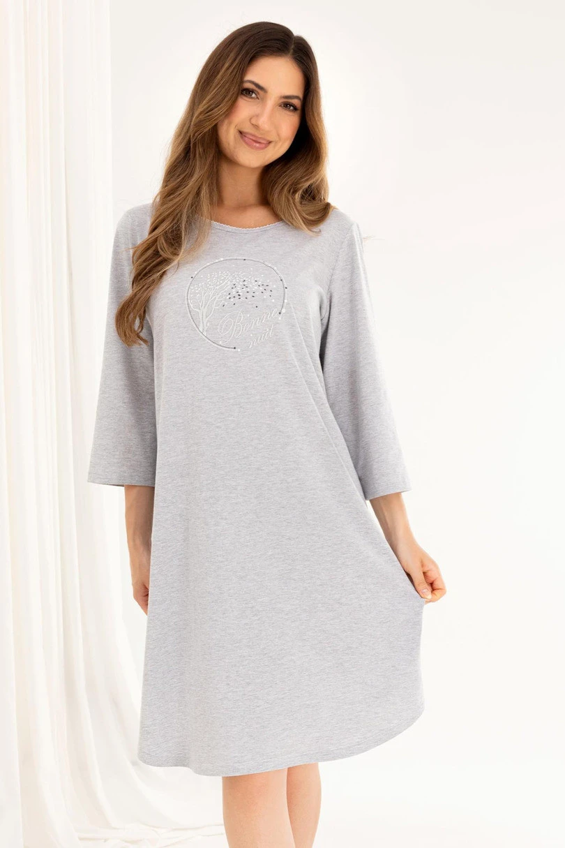 Koszula nocna 167 J/25 to idealne połączenie klasycznego fasonu i subtelnego uroku. Wykonana w 100% z wysokiej jakości bawełny, gwarantuje komfort noszenia oraz przewiewność przez całą noc. Model posiada rękaw 3/4 i półokrągły dekolt, a przód ozdobiony został delikatnym nadrukiem. Lekko rozkloszowany krój ku dołowi pięknie układa się na sylwetce, zapewniając swobodę ruchów. Długość przed kolano sprawia, że koszula jest praktyczna zarówno na cieplejsze, jak i chłodniejsze noce.