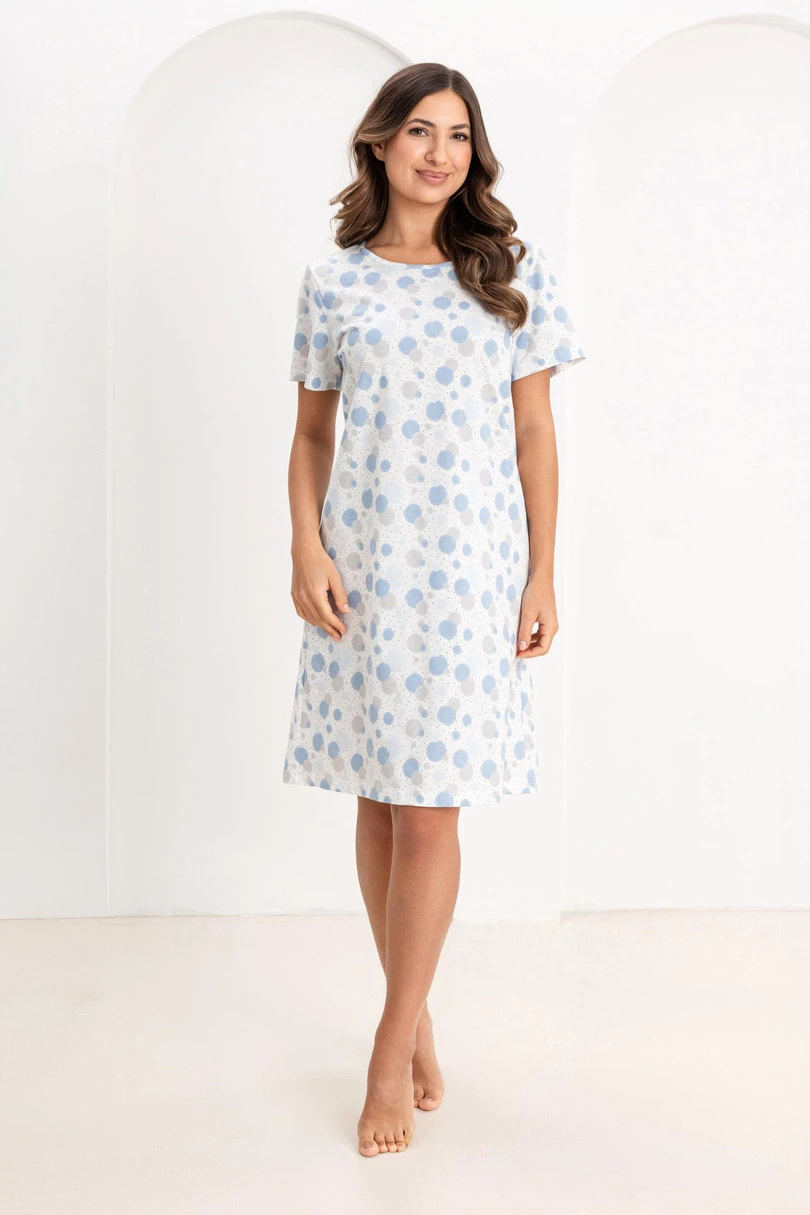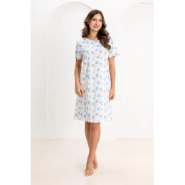 Tato dámská noční košile má jednoduchý, nadčasový střih a pohodlně se nosí. Světlé barvy a jemný, jemný vzor jí dodávají lehký a ženský charakter. Díky krátkým rukávům a délce ke kolenům je tento model ideální pro celoroční nošení. Volný střih neomezuje v pohybu, takže je tato košile ideální volbou pro spánek i domácí lenošení.