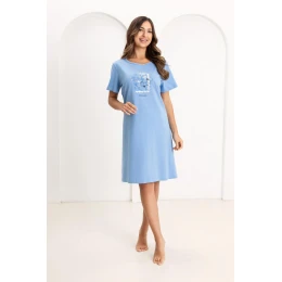 Dámská noční košile 174 BIG W/26 REGINA je pohodlnou a ženskou volbou vyrobenou ze 100% přírodní bavlny. Měkký, prodyšný materiál je šetrný k pokožce a zajišťuje pohodlný spánek po celý rok. Model s krátkými rukávy a půlkulatým výstřihem zaručuje volnost pohybu a klasický střih. Přední část košile zdobená jemným potiskem jí dodává módní, jemný charakter. Délka ke kolenům zajišťuje pohodlí a snadné nošení jak v noci, tak při domácím odpočinku. Jedná se o ideální bavlněnou noční košili pro ženy, které ocení přírodní materiály a nadčasový styl.