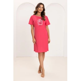 174 W/26 REGINA je pohodlná a ženská noční košile vyrobená ze 100% přírodní bavlny. Měkký, prodyšný materiál je šetrný k pokožce a zajišťuje pohodlný spánek po celý rok. Model s krátkými rukávy a půlkulatým výstřihem zaručuje volnost pohybu a klasický střih. Přední část košile zdobená decentním potiskem jí dodává módní, jemný charakter. Délka ke kolenům zajišťuje pohodlí a snadné nošení v noci i při domácím odpočinku. Jedná se o ideální bavlněnou noční košili pro ženy, které ocení přírodní materiály a nadčasový styl.