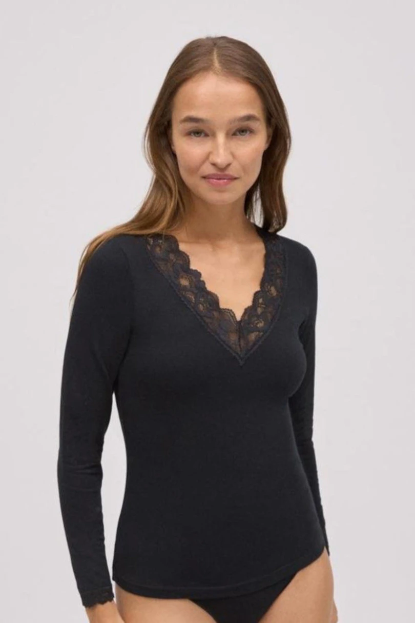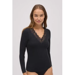 Elegantní body typu tričko z měkkého, elastického materiálu, který se dokonale přizpůsobí siluetě. Výstřih ve tvaru V zdobený jemnou krajkou dodává jemný a ženský charakter. Dlouhé rukávy zajišťují teplo a pohodlí a díky jednobarevnému provedení lze body snadno kombinovat s elegantními i každodenními outfity. Ideální pod sako, svetr nebo samostatně. Skvělá volba pro ženy, které ocení klasiku a eleganci v moderním vydání.