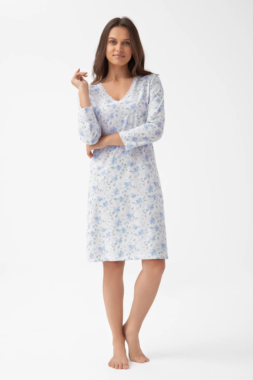 Noční košile 261 J/25 je ženský model stvořený pro pohodlí a jemnou eleganci. Je vyrobena z měkké, prodyšné bavlny a zdobí ji vzor květin a listů na klasickém bílém pozadí. 7/8 rukáv a špičatý výstřih zakončený jemnou krajkou podtrhují romantický charakter košile. Díky délce ke kolenům je tento model ideální po celý rok – v létě i v zimě.