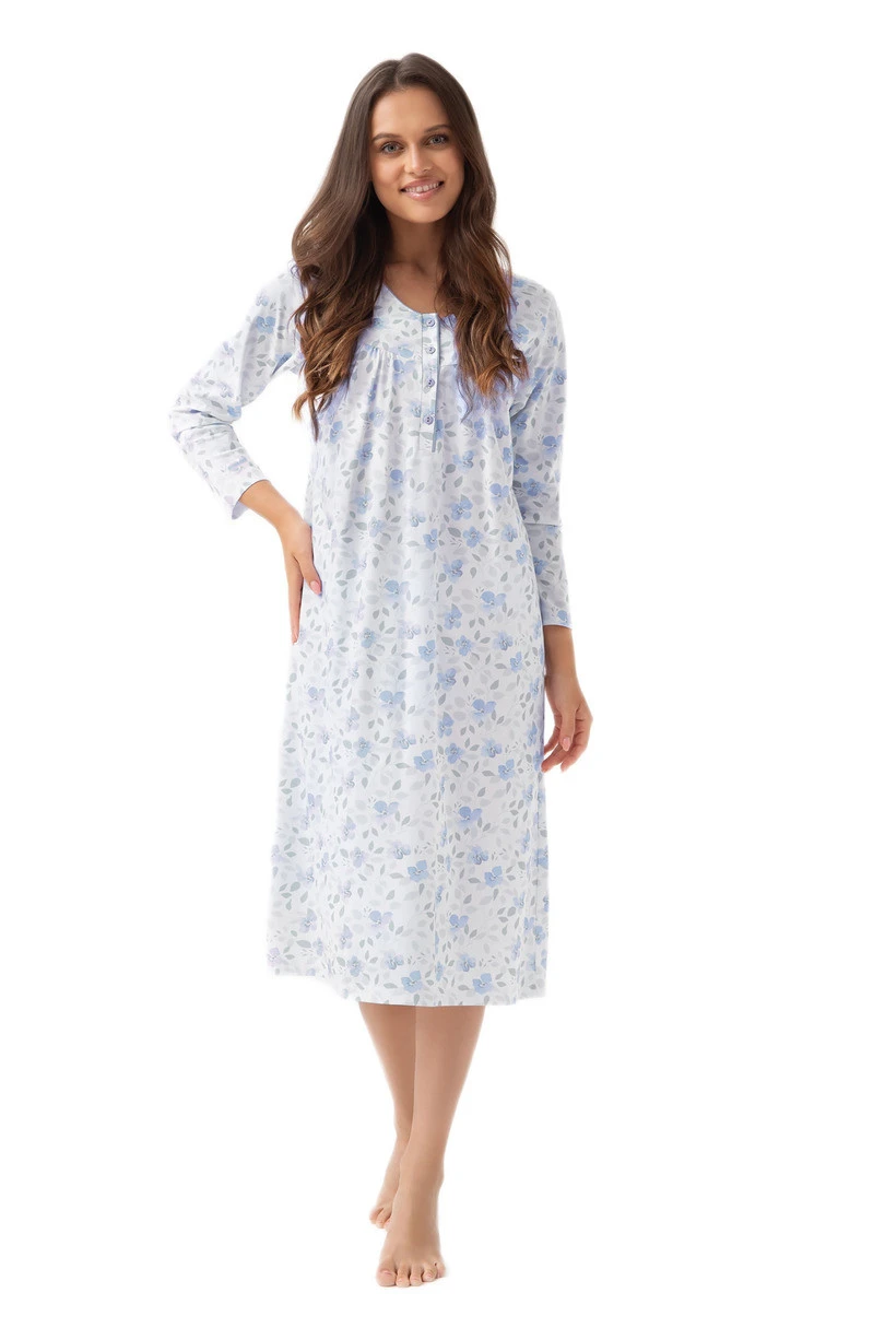 Dámská noční košile Luna 338 J/25 je esencí ženského stylu a pohodlí. Květinový vzor a volný střih zajišťují volnost pohybu a příjemné nošení. Měkký výstřih do V s mírným obloukem a řasený sed dodávají košili jemný půvab. Díky zapínání na čtyři knoflíky se snadno obléká a díky délce ke kolenům je košile ideální pro každé roční období. Je vyrobena z nejkvalitnější 100% bavlny a zaručuje pohodlný spánek a přirozenou prodyšnost.