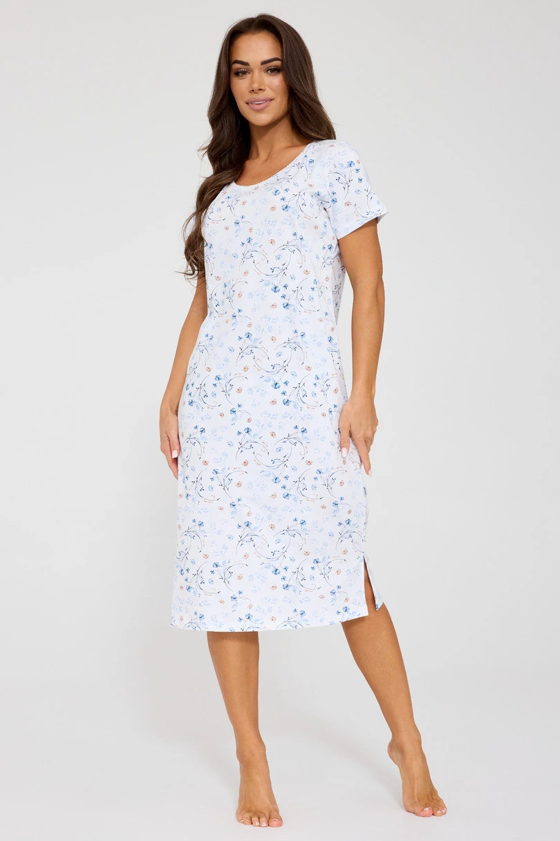 Košile má krátké rukávy a délku ke kolenům, což zajišťuje její pohodlné nošení i za teplejších nocí. Jemný květinový vzor dodává celku romantický a lehký charakter, zatímco boční rozparky zvyšují volnost pohybu a zdůrazňují ženský střih.