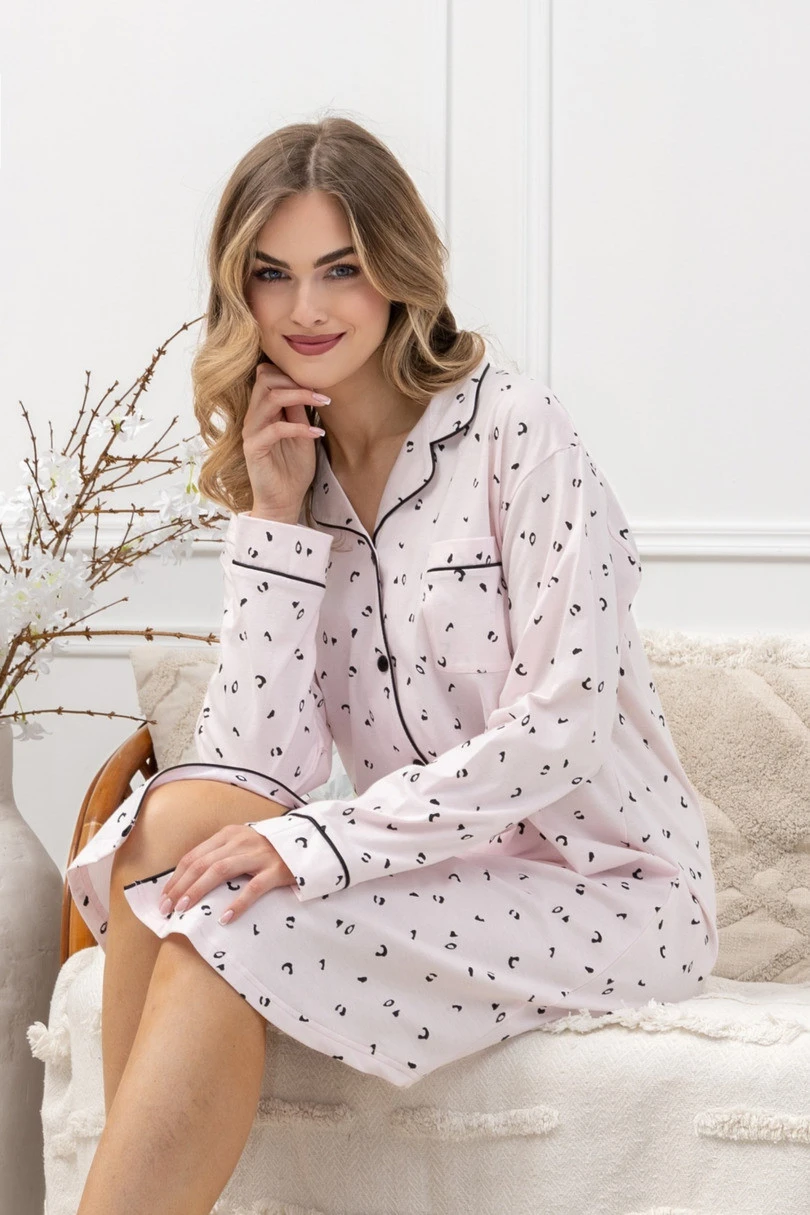 ANGELA 1619 značky Leveza je elegantní a pohodlná dámská noční košile bez zapínání, která je vyrobena z vysoce kvalitní 100% bavlny pro přirozenou prodyšnost a pohodlí při spánku. Model s délkou ke kolenům byl navržen s ohledem na funkčnost a ženský styl. Košile má klasický límeček, dlouhé rukávy s manžetou a jemné saténové lemování pro větší eleganci. Jemný vzor drobného leopardího vzoru na světle růžovém podkladu působí stylově, ale zároveň decentně. Bonusem je zaoblený lem na bocích košile, který opticky zeštíhluje siluetu a dodává jí lehkost. K dostání ve velikostech M-XL.