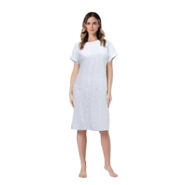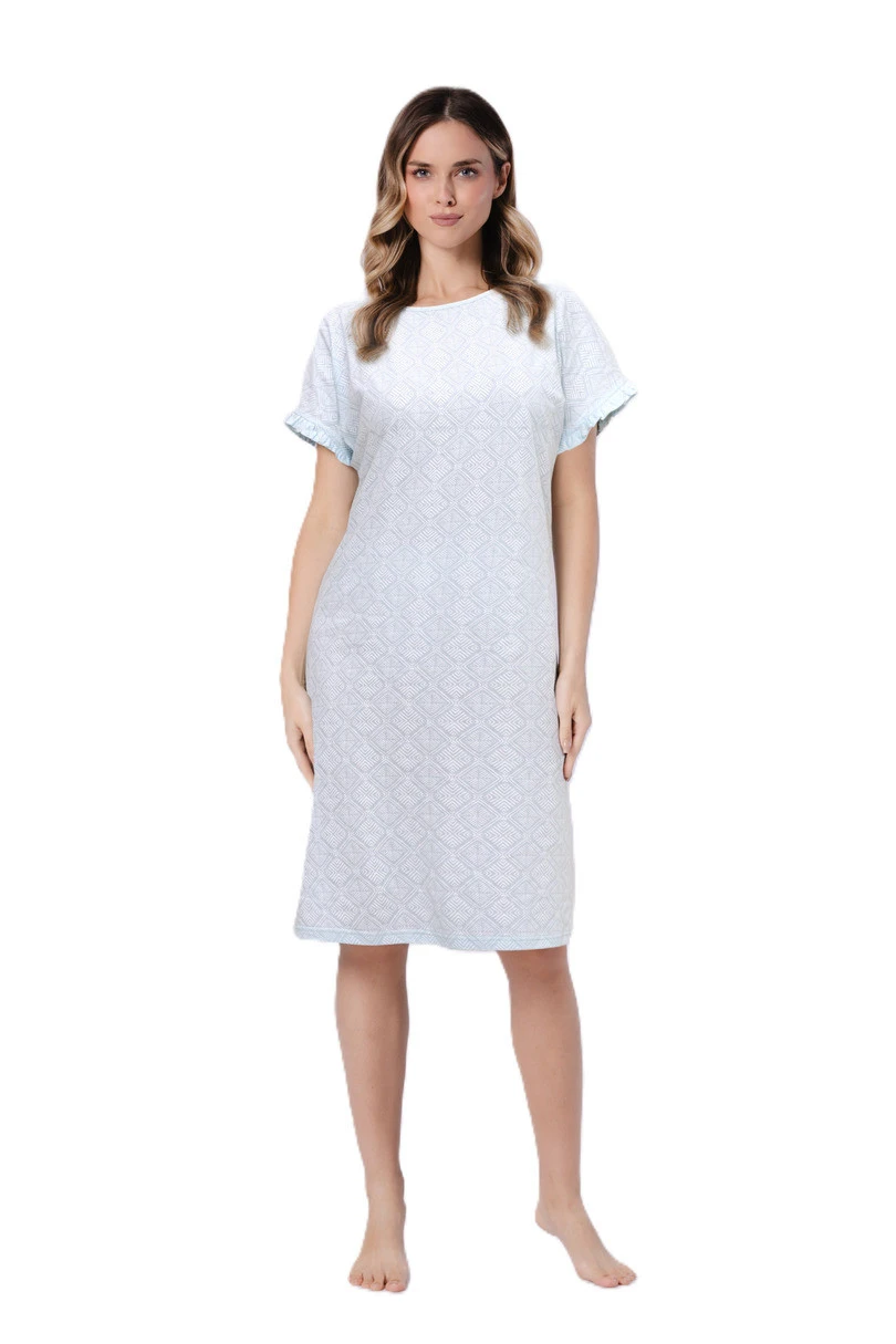 Dámská košile Clea 1730 značky Leveza má lehký, ženský design ideální pro sezónu jaro/léto. Je vyrobena ze 100% přírodní bavlny a poskytuje vynikající prodyšnost, měkkost a celonoční pohodlí. Model s mírným lodičkovým výstřihem decentně zvýrazňuje dekolt a snížená linie ramen zakončená jemným volánkem dodává košili romantický a ležérní charakter. Mátová barva v kombinaci s moderním nepravidelným geometrickým vzorem vytváří svěží a módní vzhled. Díky délce ke kolenům je košile ideální jako noční košile i jako pohodlné domácí oblečení.
