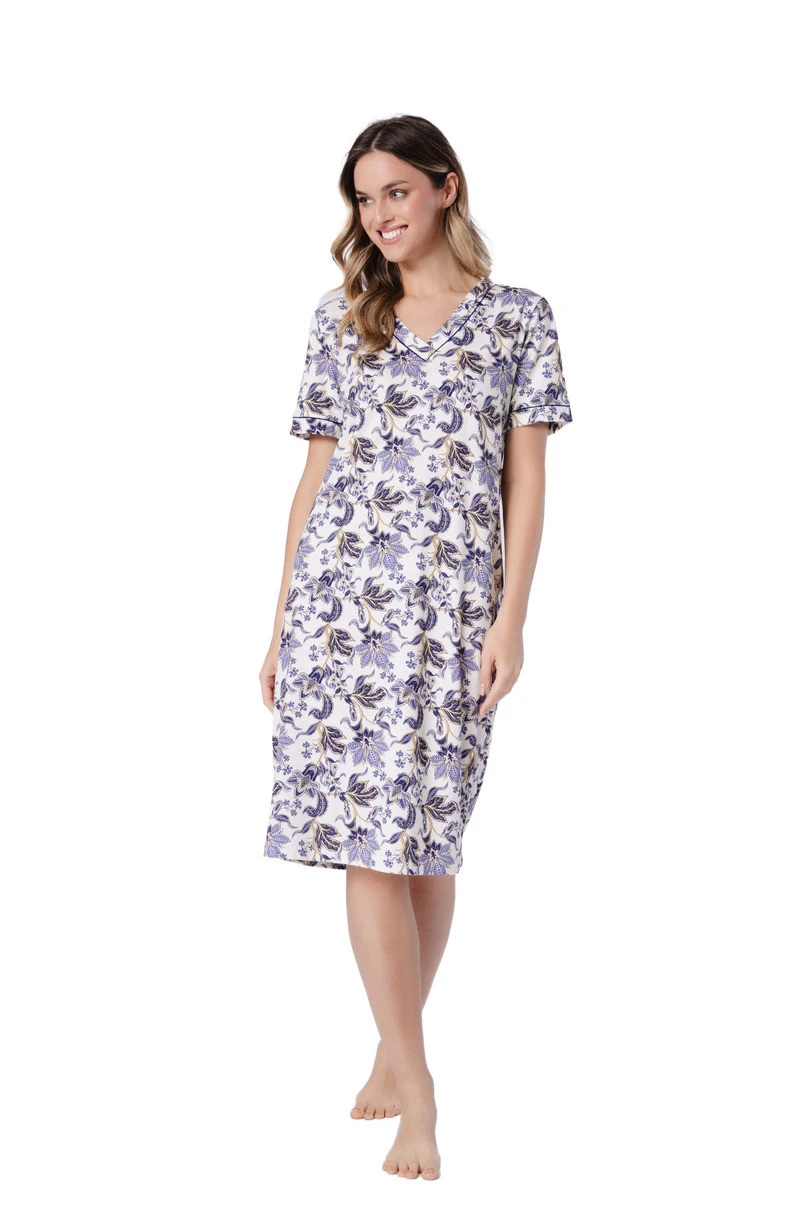 Dámská košile Ilona 1739 značky Leveza je elegantním a pohodlným návrhem pro ženy, které ocení klasický styl a nejvyšší úroveň pohodlí při nošení. Je vyrobena ze 100% ušlechtilé bavlny, je výjimečně měkká, hladká a příjemná k pokožce a zároveň zajišťuje vynikající prodyšnost. Model s výstřihem do V decentně zvýrazňuje ženskou siluetu a krátký rukáv zakončený manžetou dodává košili elegantní charakter. Kontrastní lemování v kombinaci s květinovým vzorem v barvě ecru a tmavě modré vytváří nadčasový, stylový celek. Díky délce pod kolena je košile ideální jako noční košile i jako pohodlné domácí oblečení.