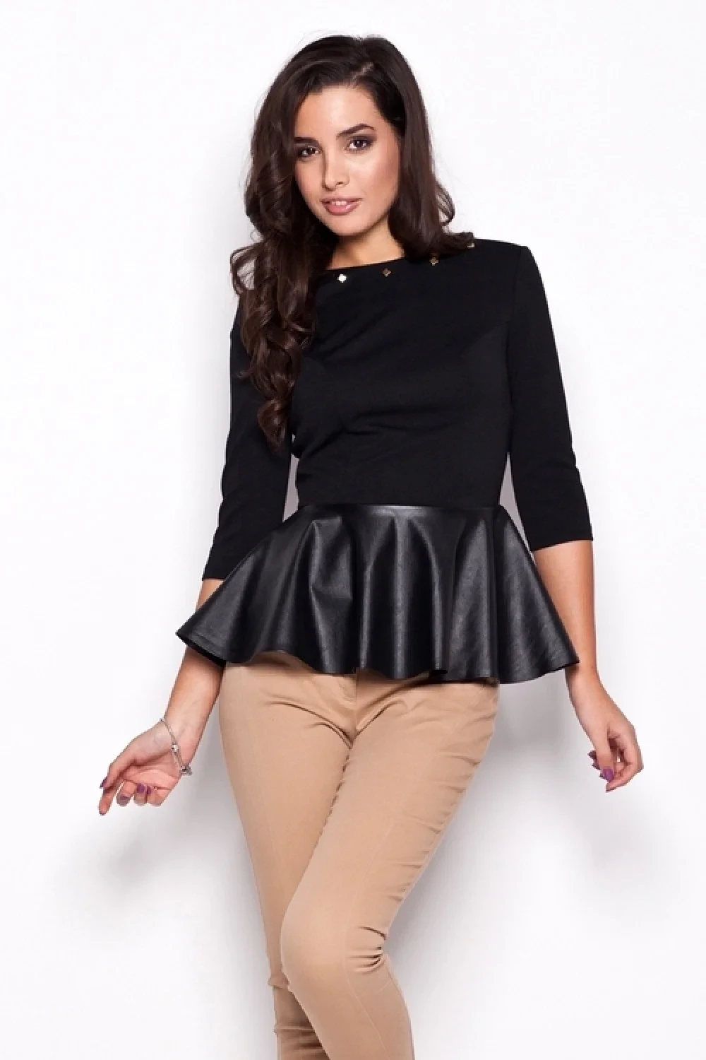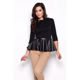 Originální dámská halenka K073 KATRUS s 3/4 rukávy svým střihem zdůrazňuje ženské křivky a pas. Kulatý výstřih je ozvláštněn zdobením. Spodní část - volánek - je vyroben z imitace kůže.