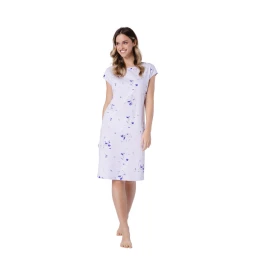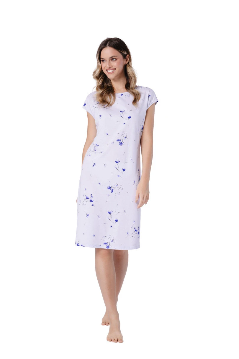 Dámská košile Karina 1736 značky Leveza je kombinací pohodlí, ženského stylu a přírodních materiálů. Je vyrobena ze 100% kvalitní bavlny, je měkká, prodyšná a šetrná k pokožce, což zaručuje pohodlný spánek. Model s krátkými rukávy a mírným lodičkovým výstřihem působí decentně a elegantně. Květinový vzor v módním odstínu inkoustově modré barvy dodává košili svěží, ženský vzhled. Délka ke kolenům a praktický dlouhý boční otvor zvyšují volnost pohybu a pohodlí. Jedná se o ideální noční košili pro jarně-letní sezónu, která se osvědčí i jako pohodlné domácí oblečení.