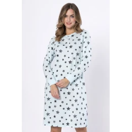 Koszula nocna KLARA 1644 marki Leveza to połączenie wygody, prostoty i subtelnej kobiecości. Wykonana w 100% z wysokogatunkowej bawełny, zapewnia komfort noszenia przez całą noc i naturalną przewiewność. Model z długim rękawem zakończonym ściągaczami sprawdzi się szczególnie w chłodniejsze dni. Klasyczny okrągły dekolt i brak zbędnych ozdób czynią tę koszulę idealnym wyborem dla kobiet ceniących minimalizm i wygodę. Dominujący kolor baby blue oraz nieregularny wzór w gwiazdki dodają całości delikatnego uroku. Długość do kolan i rozmiary od M do 2XL czynią ją uniwersalnym wyborem dla każdej kobiety.