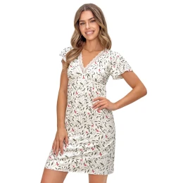 Koszula nocna damska Melisa kr/r to połączenie subtelnej elegancji i wyjątkowego komfortu. Wykonana z wysokiej jakości wiskozy z dodatkiem elastanu, jest miękka, przewiewna i doskonale dopasowuje się do sylwetki. Idealna zarówno na ciepłe noce, jak i całoroczny komfort snu. Model zachwyca delikatnym, kwiatowym printem, który nadaje całości świeżości i kobiecego uroku. Dekolt w kształcie litery „V” został obszyty subtelną koronkową tasiemką, podkreślając romantyczny charakter koszuli. Krótki rękaw typu motylek dodaje lekkości i swobody, a delikatnie marszczona gumka pod biustem pięknie modeluje sylwetkę oraz zapewnia wygodne dopasowanie. Długość przed kolano sprawia, że koszula nocna Melisa jest komfortowa i praktyczna, a jednocześnie bardzo kobieca. Model dostępny w szerokiej gamie rozmiarów od S do 2XL. Produkt pakowany w foliowy worek.