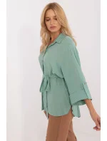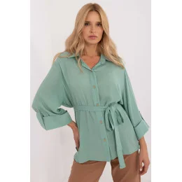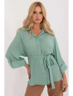 Ležérní dámská košile, ideální pro každodenní nošení i do práce. Je vyrobena z hladké jednobarevné tkaniny, jejíž převažující složkou je bavlna, a poskytuje tak pohodlí a prodyšnost. Má klasický límec a rukávy ve 3/4 délce, což jí dodává ležérní, ale stylový nádech. Košile se standardní délkou a zapínáním na knoflíky má také pásek na zavázání, který zvýrazňuje pas a dodává ženský nádech. Jedná se o univerzální kousek, který je ideální pro ležérní styling a kombinuje pohodlí s klasickým stylem.