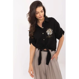 Elegantní dámská košile v casual stylu, ideální na každý den. Vyrobená z prodyšné přírodní bavlny, poskytuje pohodlí po celý den. Krátká délka a vázání dole jí dodávají lehkost a dívčí charakter, a 3/4 rukáv se skvěle hodí do teplejších dnů. Košile se zapíná na knoflíky a má klasický límeček, co jí dodává univerzální a volný vzhled. Na hrudi je praktická kapsa zdobená decentním potiskem, který představuje jemný a zároveň módní akcent.