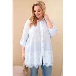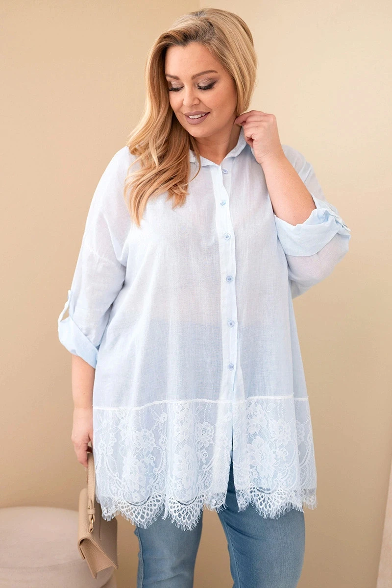 Dámská košile Plus Size bavlněná s krajkovým lemem modrá