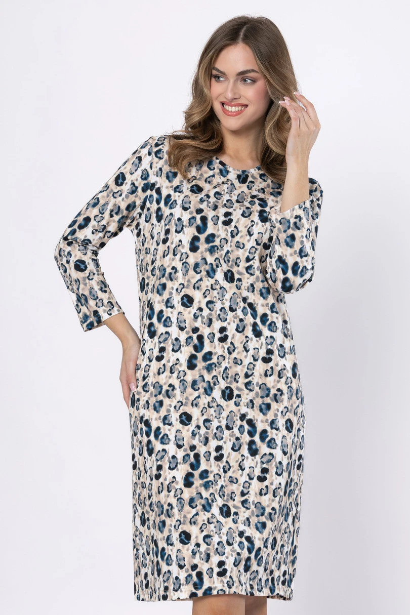 Dámská košile WITALIA 1665 značky Leveza je prémiovou nabídkou, vytvořenou pro ženy, které ocení eleganci, pohodlí a nejvyšší kvalitu. Je vyrobena ze 100% zušlechtěné bavlny a poskytuje výjimečnou měkkost, odolnost a pohodlí při celodenním i nočním nošení. Model má kulatý výstřih a módní 7/8 délku, která decentně zvýrazňuje siluetu a dodává lehkost. Zvířecí vzor leopardího vzoru v béžové a tmavě modré barvě dodává košili sofistikovaný, moderní charakter. Díky délce ke kolenům je ideální noční košilí nebo stylovým domácím oblečením pro ženy, které se rády cítí výjimečně za všech okolností.