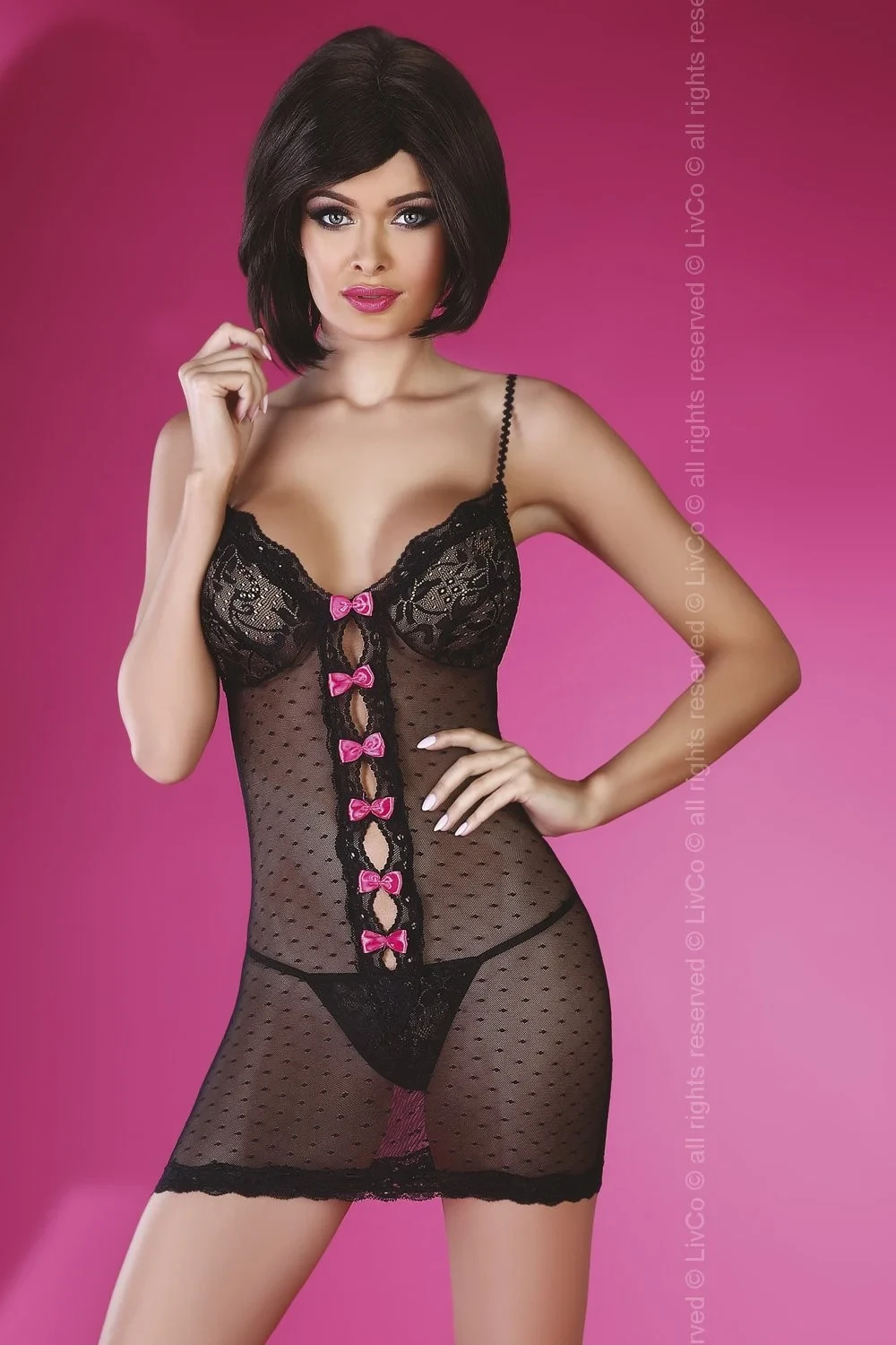 Erotická košilka Centaura LivCo - je ušita z velice jemné a pružné síťoviny a krajky s květinovým motivem - ozdobena saténovými mašličkami - trojúhelníčkové krajkové košíčky volně přecházejí v pružná a nastavitelná ramínka - spodní okraj košilky krajkový - délka košilky těsně pod zadeček - tylová tanga na pružné gumičky