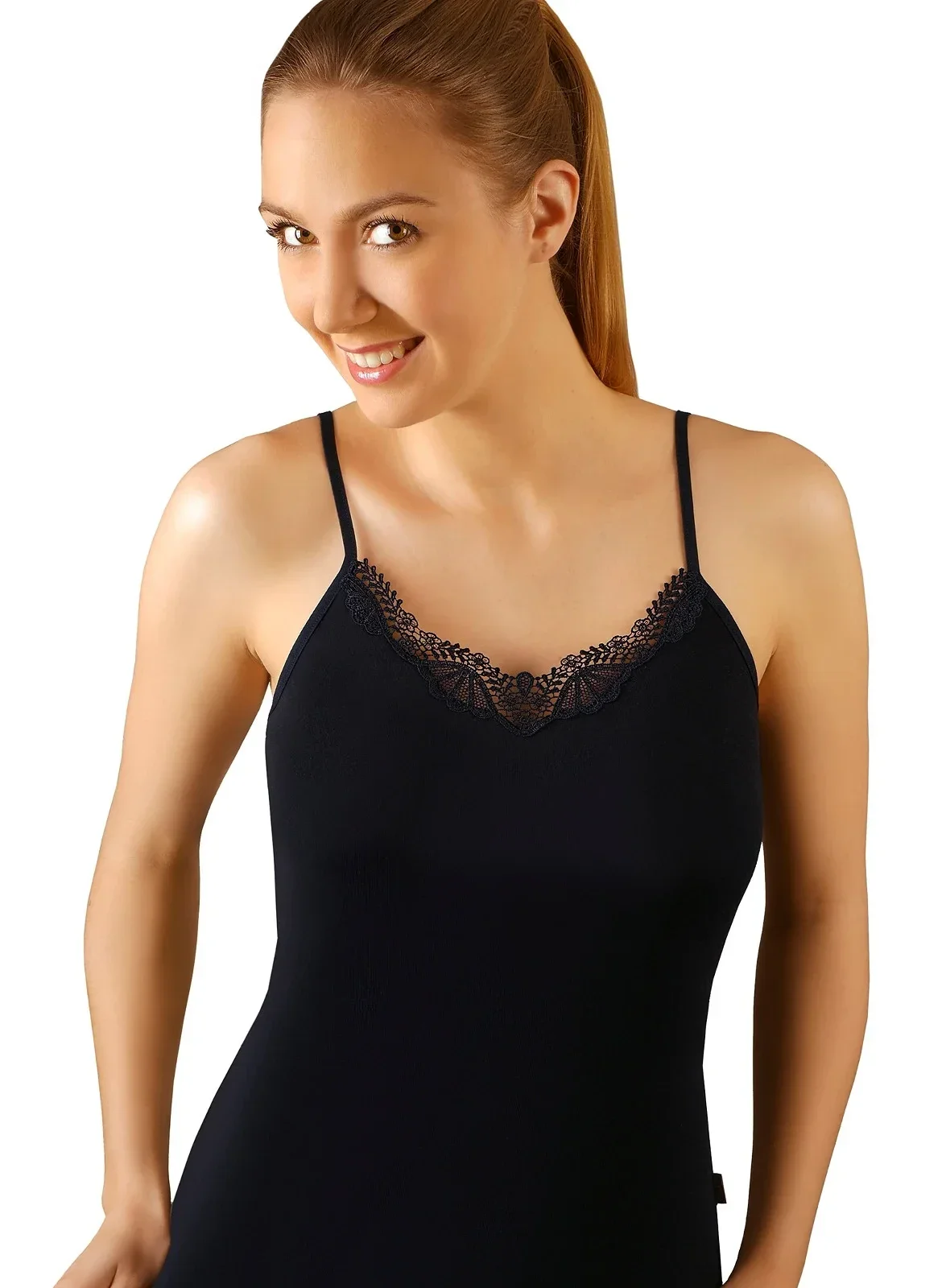 Košilka má úzká ramínka a její výstřih zdobí vsadka z efektní plastické výšivky.