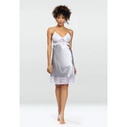 Výjimečná volba pro milovnice saténu - noční košilka Harper v krásné stříbrné barvě, doplněná bílou romantickou krajkou. Krásná a velmi ženská. Nastavitelná tenká ramínka s mini mašličkami, svůdný průsvitný efekt pod poprsím, vypasovaný horní díl a volný, vzdušný spodní díl. 100% polyester.