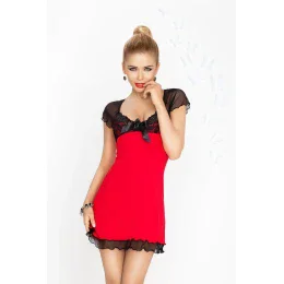 Luxusní košilka Irina Dkaren v červeno-černé barvě s krátkým kimonovým rukávem z průhledného tylu. Dekolt je ozdobený černou krajkou květinového vzoru, uprostřed kterého je dlouhá mašlička.