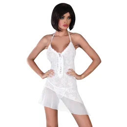 Svůdná košilka Mahalia LivCo s detailní krajkovou výšivkou - je z jemného a pružného tylu (průsvitný) s krajkou - košilka se zavazuje za krkem na tenké šňůrky - v přední části šněrování ze saténové stuhy - součástí balení jsou i krajková tanga na tenké gumičky