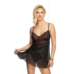 Smysly elektrizující černá éterická noční košilka z lehce průsvitného tylu, doplněná nápadnými tangy na tenkých, dvojitých ramínkách. Košilka má krásně tvarovaný výstřih zdobený krajkou pokrytou stylovým, tmavě červeným vzorem. Ramínka jsou tenká, nastavitelná, na zádech překřížená. Složení: 90 % polyester, 9 % polyamid, 1 % elastan.