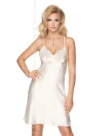 Fenomenální noční košilka z italského saténu v barvě ecru. Mírně přiléhá k tělu, velmi ženská. Na zádech výstřih, který je zakončen krásnou, květinovou krajkou, doplněný jemnými ramínky "křížem", s nastavitelnou délkou. Košilka má profilované košíčky, díky kterým výstřih vypadá atraktivně. Na přední straně krajková vsadka zakončená sladkou, malou mašličkou. Vysoce kvalitní výrobek, balený v krabičce výrobce. Složení: 93 % polyester, 6 % polyamid, 1 % elastan.