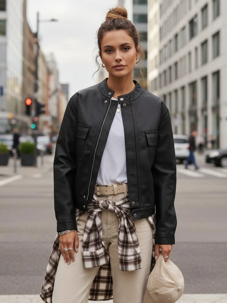 Dámská bunda klasického krátkého střihu z ekokůže. Jednoduchý tvar byl doplněn funkčními detaily, které dodávají celkovému vzhledu moderní a strukturovaný charakter. Model kombinuje volnost nošení s jasně definovanou linií, díky čemuž se hodí pro každodenní styling. Design odpovídá potřebám přechodného období.