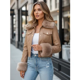 Dámská kožená bunda s ozdobnou kožešinou je návrhem pro ženy, které ocení styl a pohodlí v jednom. Krátký zkrácený střih dokonale zvýrazňuje pas, zatímco poutavé lemy na límci a manžetách přitahují pozornost. Skvěle se hodí ke každodenním i večerním outfitům.