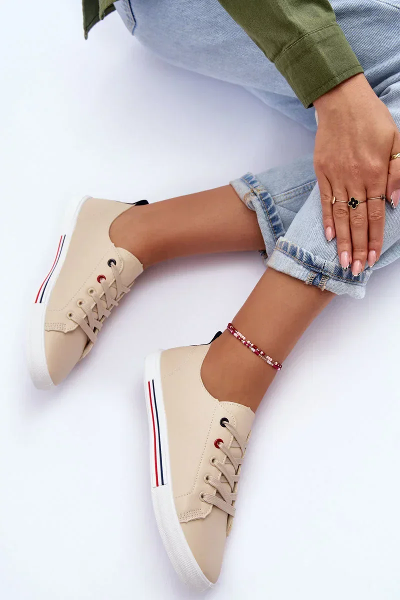 Dámská sportovní obuv s nízkou podrážkou. Klasický šněrovací model. Měkká stélka zajišťuje pohodlné používání obuvi. Zaoblené prsty. Tyto tenisky budou jistě dobře fungovat v mnoha stylech! Při výběru velikosti se řiďte tabulkou velikostí.
