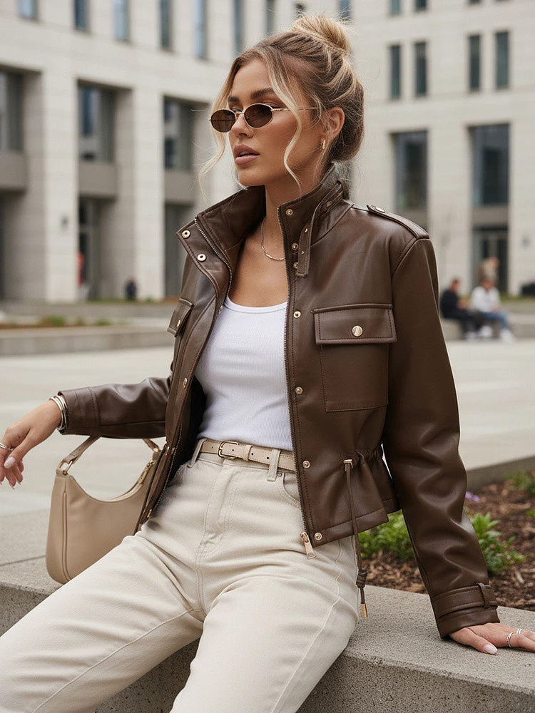 Bunda z ekologické kůže se dobře osvědčuje v přechodných ročních obdobích, chrání před větrem a lehkým chladem. Nastavení pasu umožňuje individuální střih, díky němuž dobře sedí na postavě.
