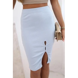Tato dámská pruhovaná bavlněná sukně je výjimečně ženský model, který zdůrazňuje siluetu a díky elastickému úpletu se dokonale přizpůsobuje tělu. Subtilní rozparek na stehně zakončený ozdobnými knoflíky dodává stylizaci jemný, módní charakter. Ideální na léto, jaro a do každodenních stylizací — skvěle se kombinuje s topy, tričky a lehkými košilemi.