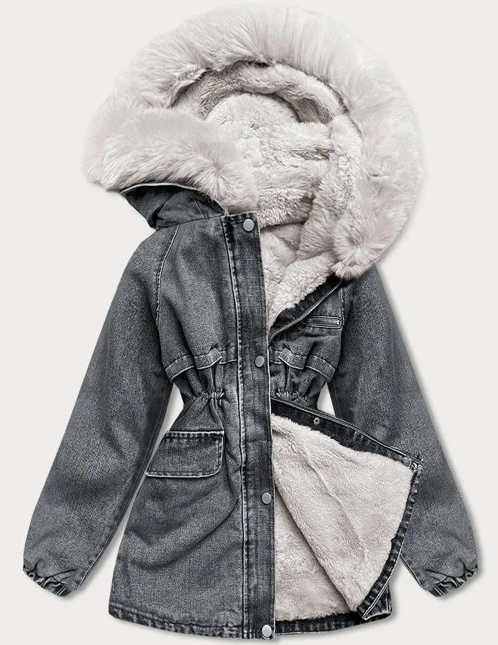 Černo/ecru dámská džínová bunda s kožešinovou podšívkou (br8048-1046)