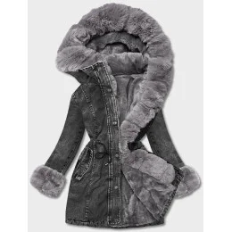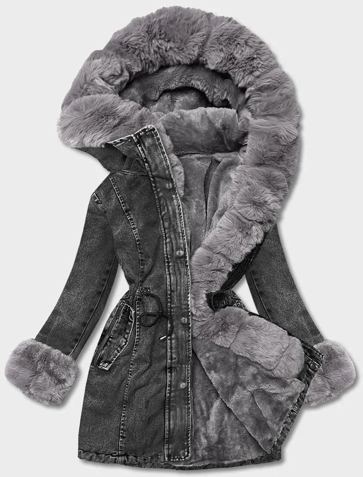Černo/šedá dámská džínová bunda s kožešinovou podšívkou (B8068-109)
