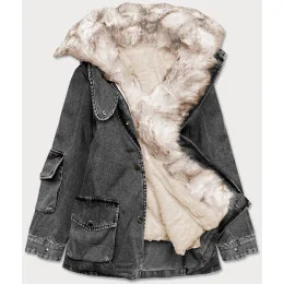 Černo/béžová dámská džínová bunda s kožešinovým límcem (br9585-1046)