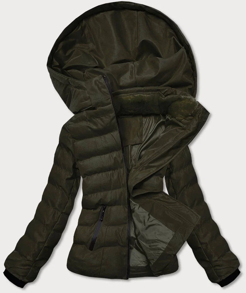Dámská zimní bunda v army barvě s kožešinovým stojáčkem (5M769-136)