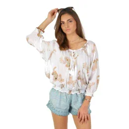 Mladistvý svůdný cropp top s širokým výstřihem, který lze stáhnout na ramena a regulovat šňůrkou se střapečky. Pro dámskou letní tuniku - top s 3 širokými, řasenými rukávy ukončenými gumičkou najdete široké využití. Zlatý potisk poloprůhledné tuniky je krásně doplněn korálkovou výšivkou.