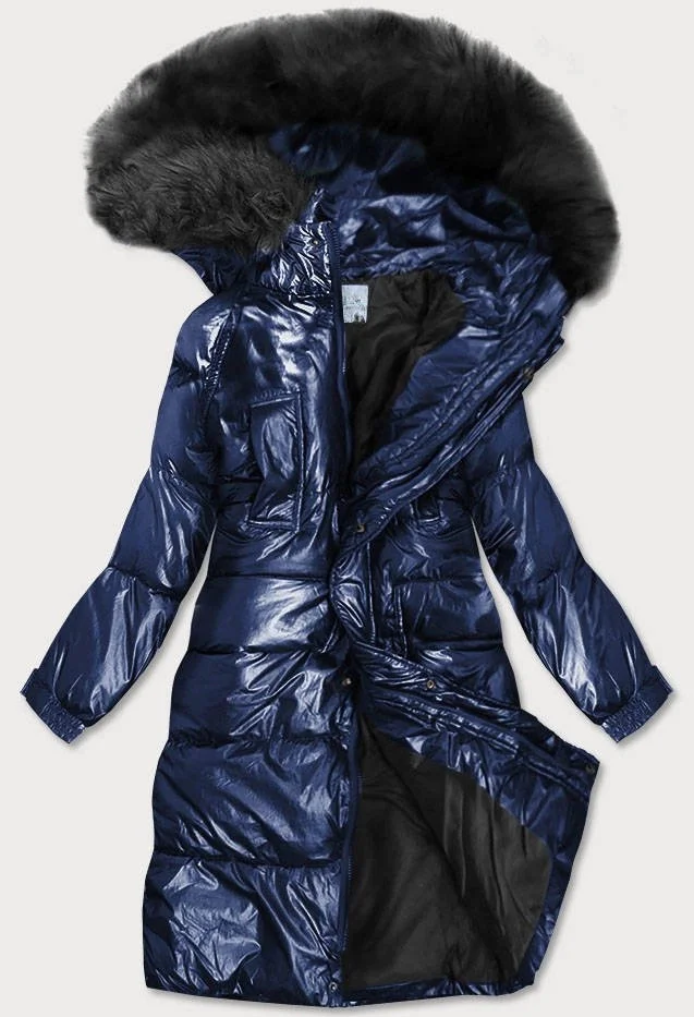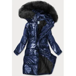 Tmavě modrá dámská zimní metalická bunda s kapucí (8295)