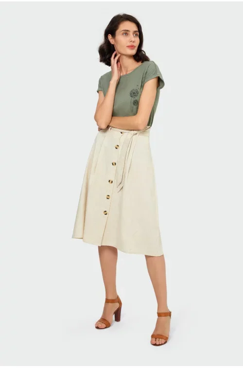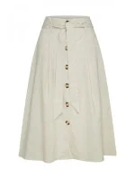 Elegantní sukně s vysokým pasem. Délka pod kolena. Zapínání na knoflíky po celé délce vpředu. Připojený pásek v pase, který zvýrazňuje postavu. Ležérní střih. Vyrobeno z tkaniny příjemné na dotek. Modelka na fotografii měří 179 cm a nosí velikost 36.