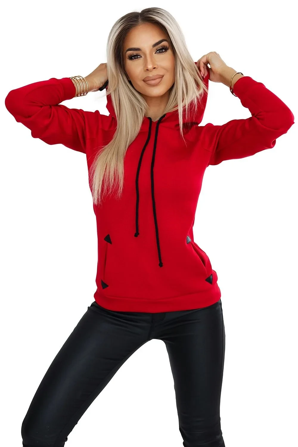 Dámská mikina 262-2 NUMOCO - červená barva - z bavlněného materiálu příjemného na dotek - dlouhé rukávy - s kapsami - šňůrky u kapuce a ozdoby kolem kapes tmavě modré barvy - s kapucí