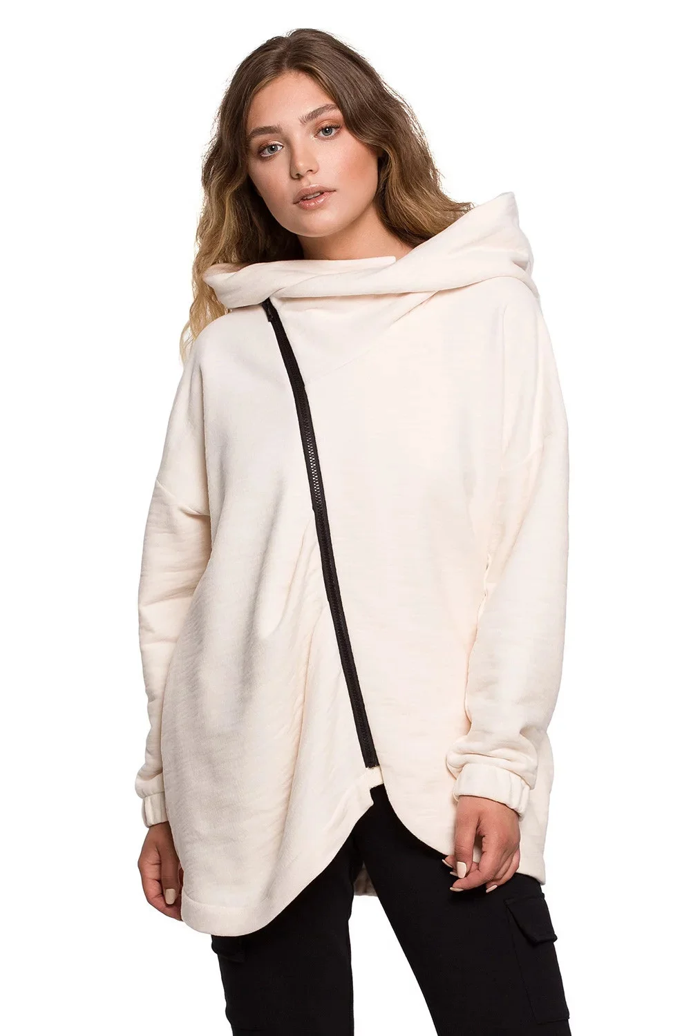 Hřejivá mikina s diagonálním zipem, příjemným límcem a prostornou kapucí. Střih připomíná tvar přesýpacích hodin - v pase je mírně zúžený a vzadu, ve spodní části, má všitou gumičku, která mikině dodává tvar.