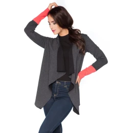 Mikina z pletené mikiny ponechaná vcelku. Rukávy zakončené manžetou v kontrastní barvě. Skvěle se hodí k džínům i k elegantním šatům.