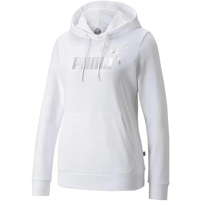 Dámská mikina Puma ESS+ Metallic Logo Hoodie FL bílá 849958 02 Dámská mikina Puma uspokojí potřeby všech žen, které hledají pohodlné každodenní nošení. Model získal konstrukci z měkké bavlny a odolného polyesteru. Klasický střih umožňuje plný rozsah pohybu. Integrovaná kapuce nastavitelná pomocí šňůrek chrání hlavu před nepříznivým počasím. Pružné žebrování na manžetách a spodním lemu. Klokaní kapsa na drobnosti. hlavní materiál: 68 % bavlna, 32 % polyester